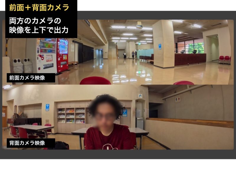 360度映像だけでなく、前と後ろの映像を上下に分けて映せるため、複数人で話す場面でも便利です。