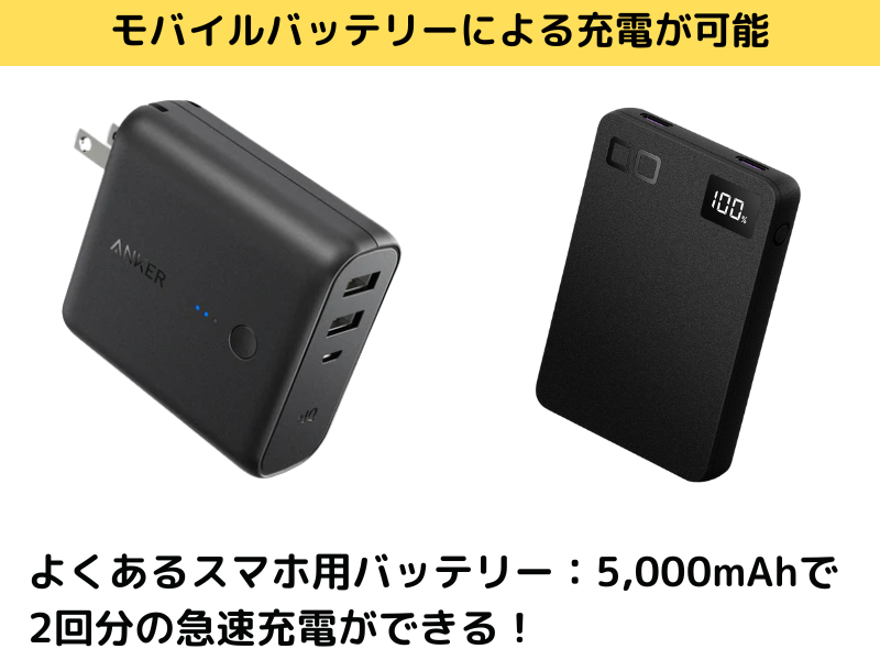 でも、実はモバイルバッテリーを活用すれば、予備バッテリーをわざわざ買わなくても十分に運用できます。