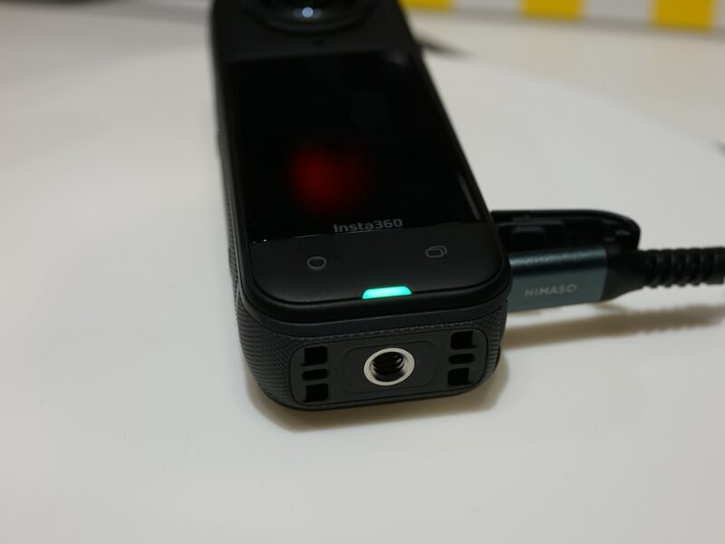insta360 X5は、撮影中でもUSB-Cケーブルを使って充電しながら撮影できます。