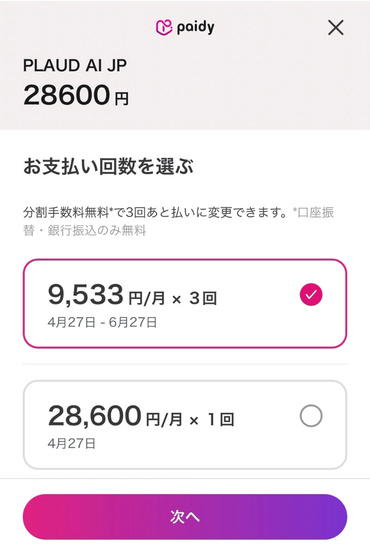 - Plaud Noteの購入画面で支払い方法で「ペイディ」を選ぶ