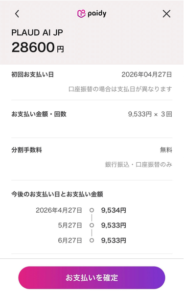 さらにアプリで本人確認をすれば分割手数料0円の3回あと払いも選べるようになり、月々の負担をグッと抑えてPlaud Noteを使い始められます。